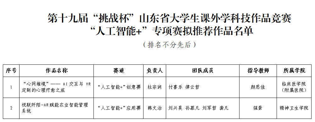 根据团省委《关于开展第十九届“挑战杯”大学生课外学术科技作品竞赛“人工智能+”专项赛的工作提示》的相关要求,经自主申报、学院推荐、校团委审核等环节,现将拟推荐参加第十九届“挑战杯”大学生课外学术科技作品竞赛“人工智能+”专项赛的作品名单予以公示。